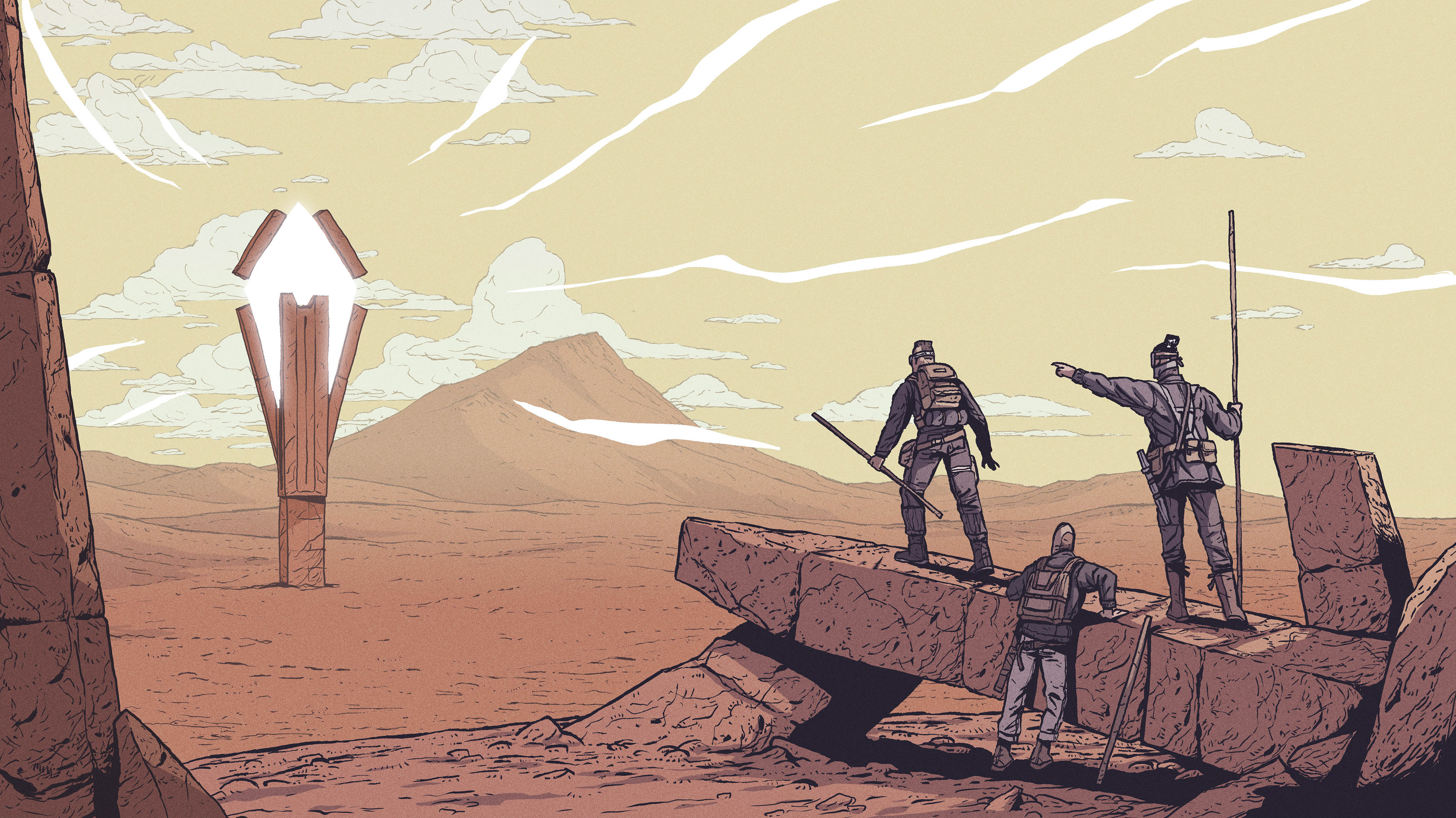 Three explorers witness the activation of an Ancient Catalyst as it drains the surrounding's energy to feed itself.